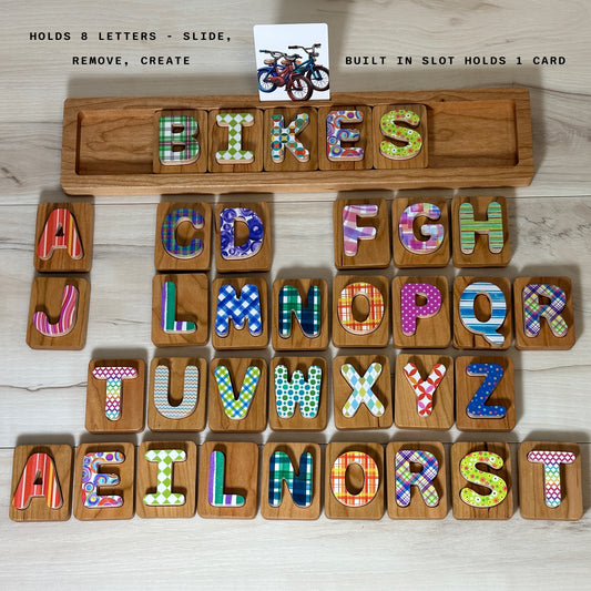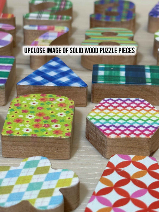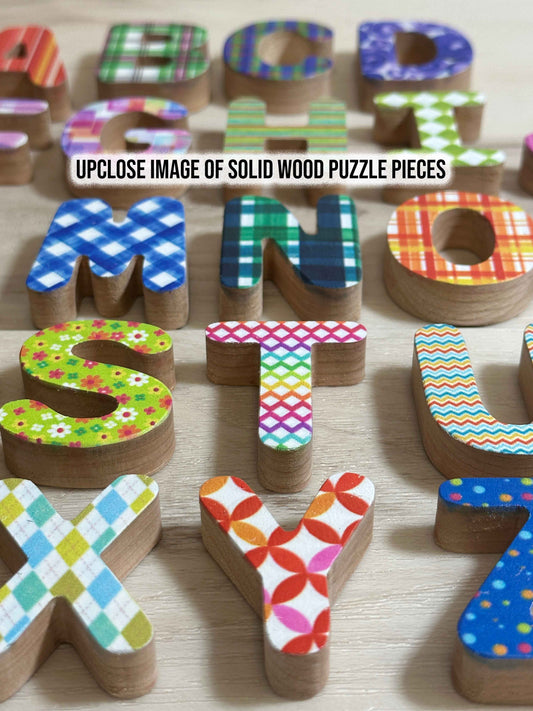 ABC-123 FlipCraft Round 13" Solid Wood Puzzle, Dual-Sided, 26 Letters, 0-9 and 16 Shapes, Demin